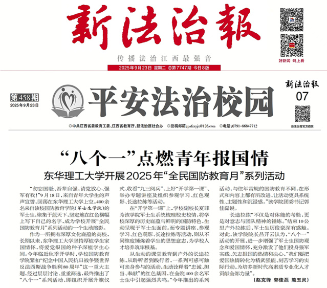 编者按:9月23日,《新法治报》报道东华理工大学开展的2025年“全民国防教育月”系列活动,引发社会广泛关注。现将原文转载如下: