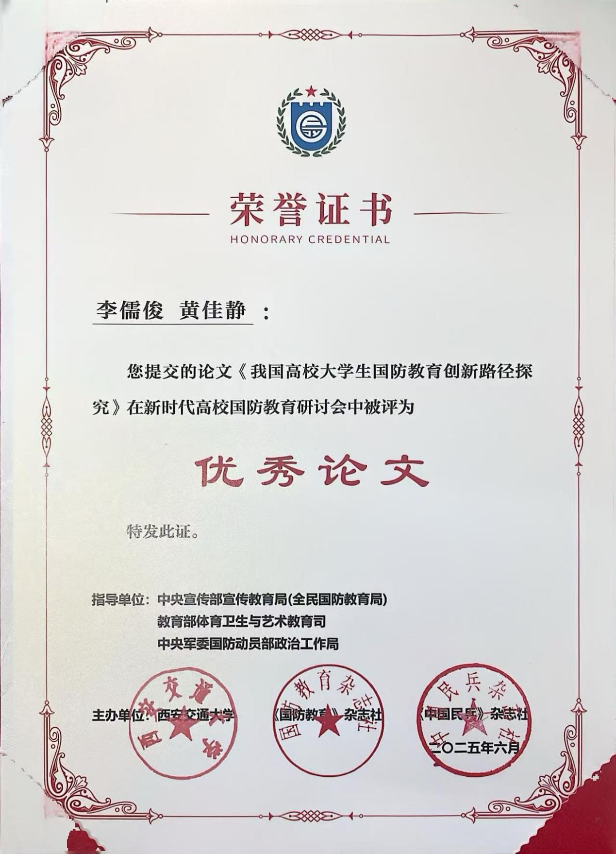近期,2025年新时代高校国防教育研讨会在西安交通大学成功举办。此次研讨会由中央宣传部宣传教育局(全民国防教育局)、教育部体育卫生与艺术教育司、中央军委国防动员部政治工作局指导,西安交通大学、《国防教育》杂志社、《中国民兵》杂志社联合主办,旨在深入贯彻落实习近平总书记关于加强全民国防教育的重要指示精神和新修订的《中华人民共和国国防教育法》,集智攻关、集思广益,聚力提升新时代高校国防教育质效。在会上,我院李儒俊教授、黄佳静老师撰写的《我国高校大学生国防教育创新路径探究》论文经专家组多轮评审,从众多参评作品中脱颖而出,被评为“优秀论文”。