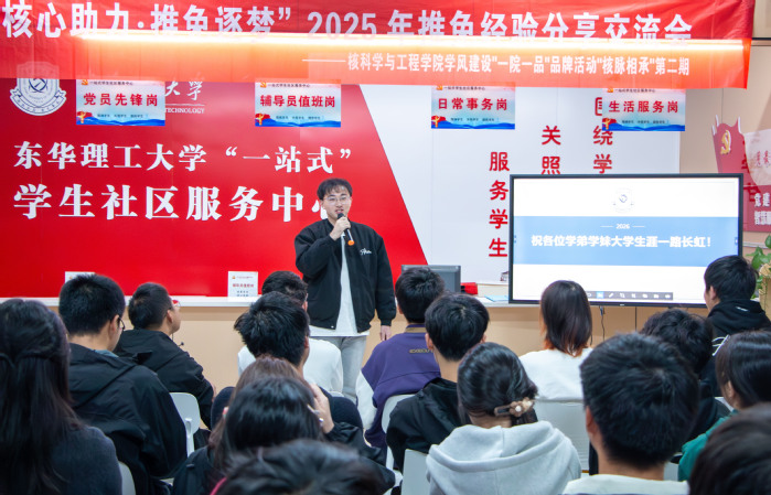 为深化“一院一品”学风建设品牌内涵,助力学生精准把握推免政策、科学规划升学路径,11月4日下午,东华理工大学核科学与工程学院在广兰校园“一站式”学生社区(学生宿舍南区9栋)举办了“一院一品”学风品牌“核脉相承””第二期活动“推免经验分享交流会”。学院全体辅导员、2名成功推免西安交通大学的2022级核工程与核技术专业学生及50余名学生代表参加了活动。