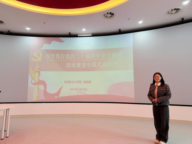 欧阳霞以“深学笃行党的二十届四中全会精神,接续推进中国式现代化”为题作专题宣讲。她系统梳理了全会的重大理论创新与战略部署,强调要深刻把握中国式现代化的历史逻辑、实践要求和使命任务,鼓励青年学生将个人理想融入国家发展大局,在科技创新、乡村振兴、文化传承等领域勇担重任。