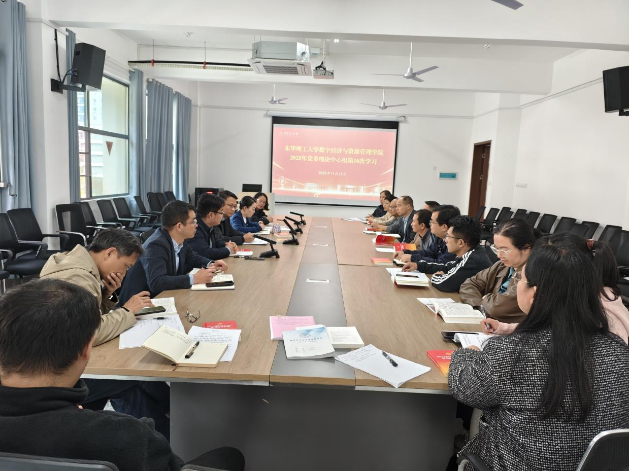11月11日,数字经济与资源管理学院党委书记黄宝华主持召开2025年党委理论学习中心组第10次学习(扩大)会,专题学习党的二十届四中全会精神。学院党委理论学习中心组成员、全体科级干部和各党支部书记参会。