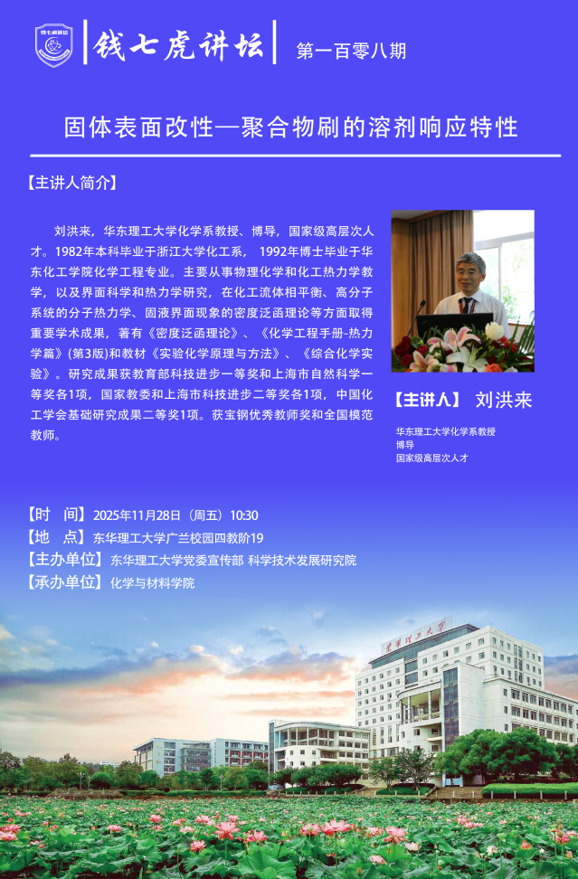 【钱七虎讲坛第一百零八期预告】固体表面改性—聚合物刷的溶剂响应特性