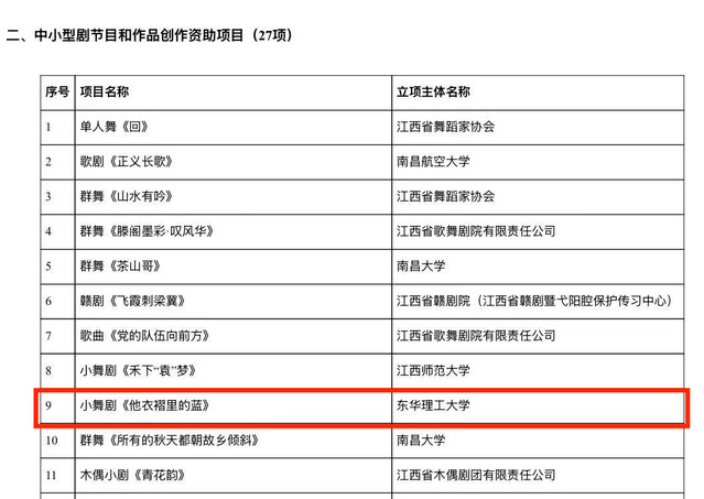 近日,江西文化艺术基金2025年度资助项目名单正式公布,体育与艺术学院原创小舞剧《他衣褶里的蓝》成功入选“中小型剧节目和作品创作资助项目”。该项目入选不仅体现出艺术创作领域的显著成果,也是文化赋能科技发展的重要体现。江西文化艺术基金是省内推动艺术事业繁荣发展的重点项目,立项竞争激烈、含金量高。本年度,全省仅有27个中小型剧节目获得资助。
