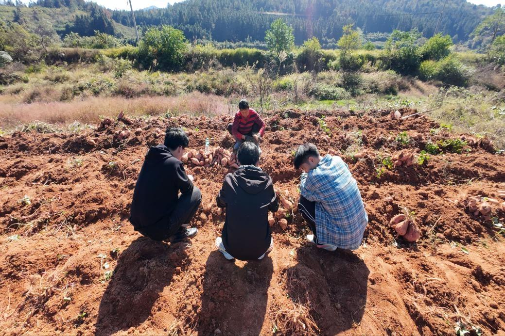 金秋时节的乡村硕果累累,师生们随即投入“助农采收”劳动实践。橘子园里,同学们在农户指导下细心采摘、轻拿轻放,主动询问品种特性、种植技术及销售情况;红薯地里,大家挽袖挥铲、循藤挖掘,亲身感受“汗滴禾下土”的辛劳与“颗粒归仓”的喜悦。