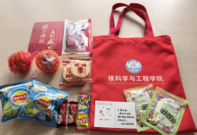 学院为学子们精心准备了寓意深长的能量礼包:红色帆布袋象征吉祥如意,文具礼包寓意逢考必“过”,苹果与脐橙代表“苹”稳上岸与一战“橙”硕,棒棒糖暗含“榜上有名”,脆脆鲨鼓励“巧克”难题,旺旺雪饼与乐事薯片则寄托运气旺旺、好事成双的祝福;另有暖宝宝及学院全体辅导员们的亲笔书写的贺卡,每一份礼物都凝聚着学院对考研学子的真挚关怀。学院领导为学生代表发放礼包。