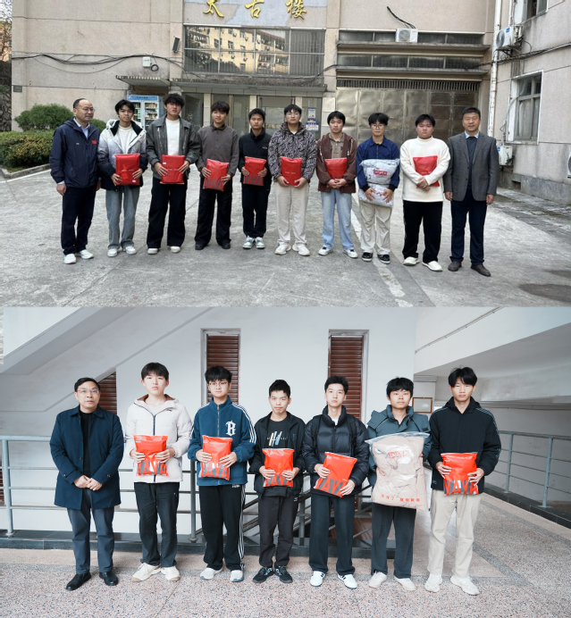 走访结束后,师生一同在“太古楼”前合影留念。照片中,同学们手捧印有学院标识的红色慰问袋,笑容满面;老师站在两侧,神情温和关切。这一刻,温暖不仅仅在手中,更在彼此的表情与姿态中自然流露。
