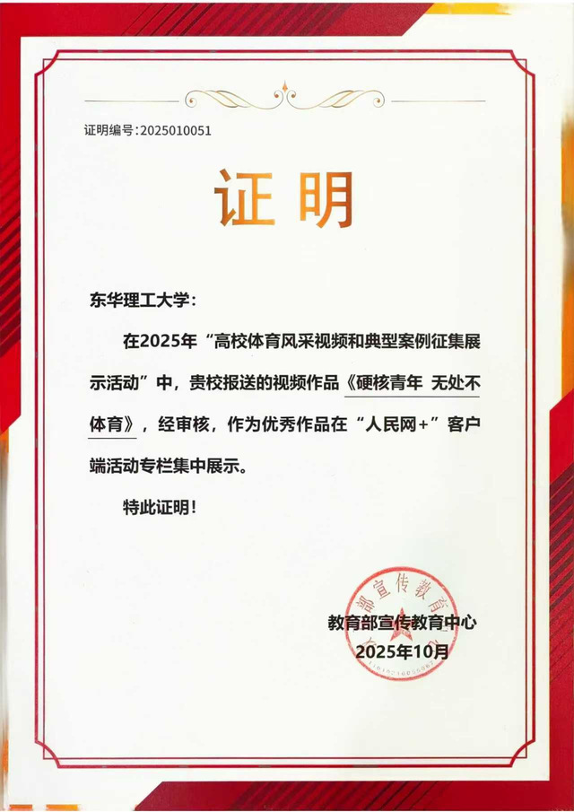 近日,由教育部宣传教育中心主办的2025年“高校体育风采视频和典型案例征集展示活动”获奖结果公布。东华理工大学选送的视频作品《硬核青年 无处不体育》成功入选,并在“人民网+”客户端活动专题栏目集中展示。