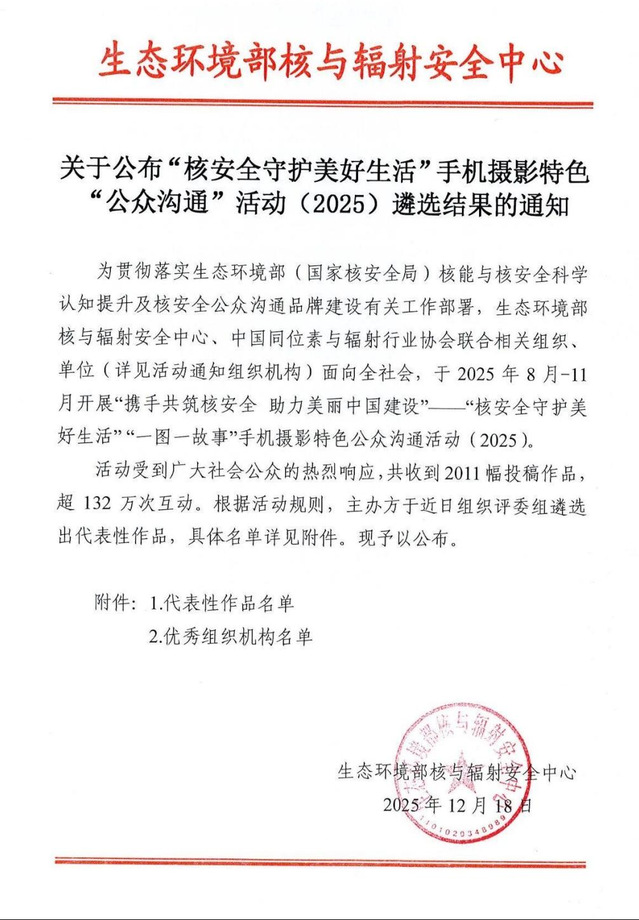 本次活动以“ 一图一故事”形式,生动展现核安全形象,捕捉美丽中国、幸福生活、严格监管及行业一线的精彩瞬间,同时普及核安全科学知识,汇聚行业力量,推动核安全水平持续提高。活动自开展以来,受到社会各界广泛关注,共收到投稿作品2011幅,实现互动超132万次,取得热烈社会反响。(图/陈熊思迪 文/李依彤 黄艺文)