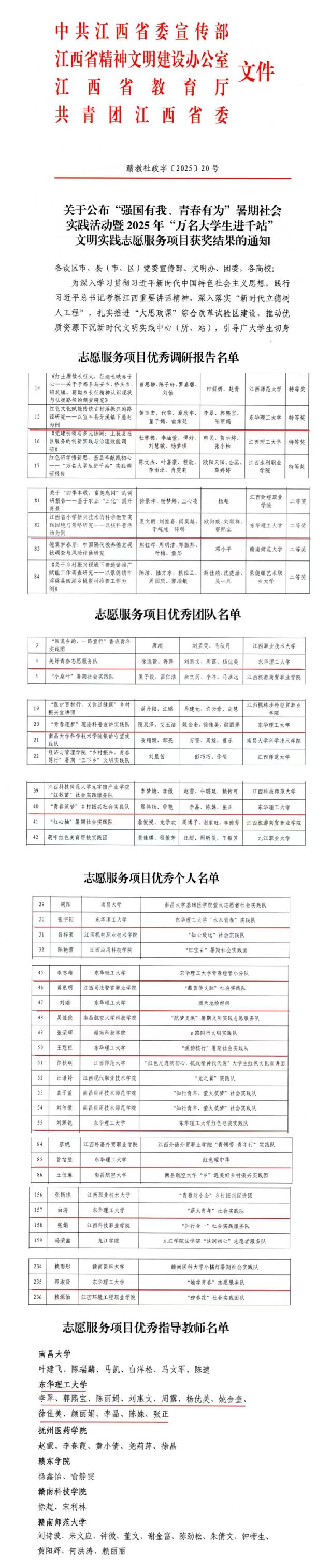 东华理工大学选送的调研报告《红色文化赋能传统古村落振兴的路径研究——以宜丰县芳溪镇下屋村为例》获评优秀调研报告特等奖,《江西省小学新兴技术的科学教育实践困境与策略研究——以核科普活动为例》获评优秀调研报告二等奖。美好青春志愿服务队、“青春逐梦”理论科普宣讲实践队、“青春筑梦”乡村振兴社会实践队获评优秀团队。张宇阳、李志雄、刘瑞、王煜祖、刘源铠、昝绪胜、白涛、郭淑贤8位同学获评优秀个人。李翠、郭熙宝、陈丽娟、刘惠文、周露、杨优美、姚金奎、徐佳美、颜丽娟、李晶、陈姝、张正12位教师获评优秀指导教师。