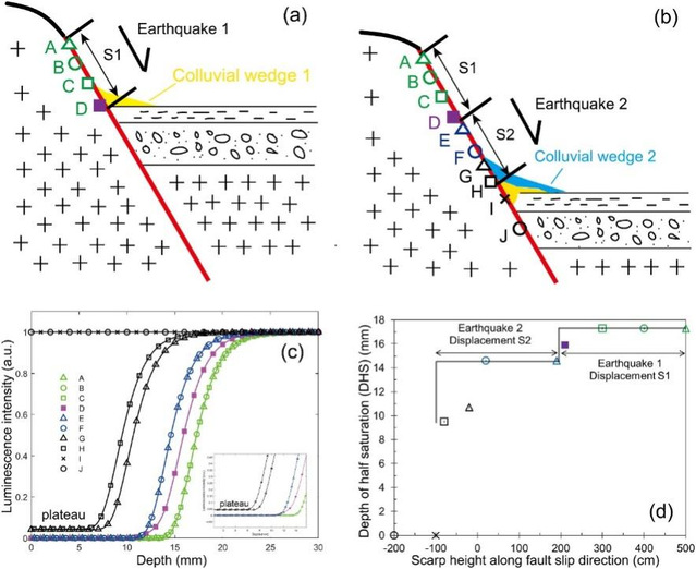 该成果针对基岩区地震活动性研究难以开展的问题,利用不同期次的地震会造成不同高度基岩正断层的暴露时间不同,以及产生的崩积楔会覆盖曾经暴露的断层面底部的原理,通过岩石表层光释光测年方法研究地表以上的断层面与被崩积楔覆盖的基岩面的暴露/埋藏历史,从而重建基岩断层的活动历史以及崩积楔的堆积过程。