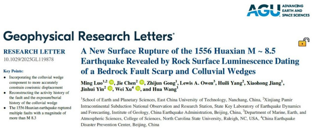 近日,东华理工大学地球与行星科学学院罗明博士作为第一作者,在国际权威地球科学期刊《Geophysical Research Letters》上发表了题为《A New Surface Rupture of the 1556 Huaxian M ~ 8.5 Earthquake Revealed by Rock Surface Luminescence Dating of a Bedrock Fault Scarp and Colluvial Wedges》的研究成果。该研究以东华理工大学为第一署名单位,联合中国地震局地质研究所(通讯作者陈杰研究员)、北卡罗莱纳州立大学和中国震防中心等国内外高校及科研院所合作完成。