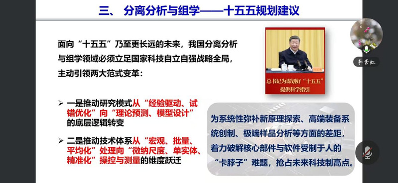2月5日,李景虹教授围绕分离分析与组学的内涵、重要进展及下一步建议,作了精彩的报告,重点围绕“分离新原理与新方法”“AI驱动的分离介质理性设计与可控制备”“高通量和极限分辨率分离装备的创制”“微纳尺度分离分析与微流控芯片技术”等十个前沿方向进行深入分析,鼓励广大教师瞄准国家重大战略需求,聚焦国际前沿的原创科学研究。