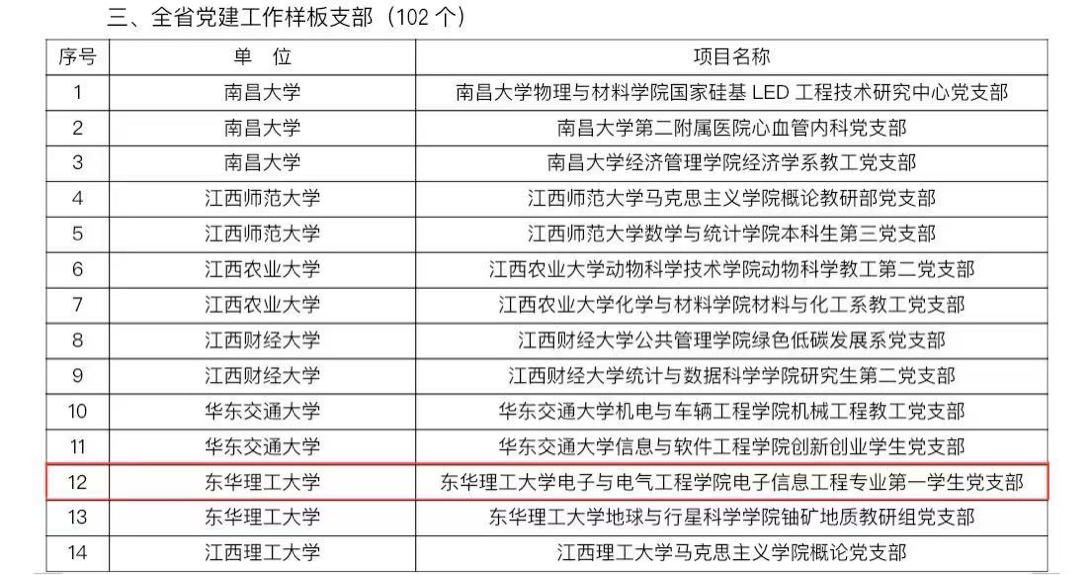 近日,中共江西省委教育工作委员会、江西省教育厅公布全省第二批新时代高校党建示范创建和质量创优培育创建单位名单,东华理工大学电子与电气工程学院电子信息工程专业第一学生党支部入选“全省党建工作样板支部”创建培育单位,取得学院在该项目上历史性突破。(文/图 金珊 江思军)