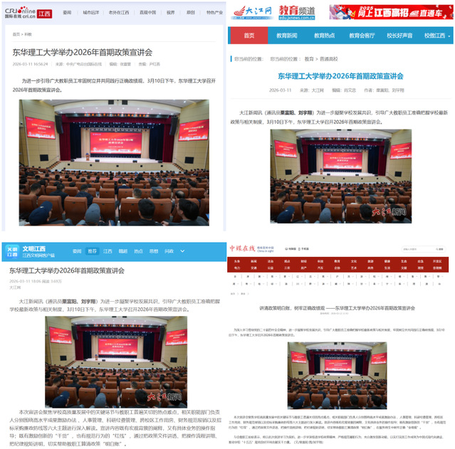 编者按:为深入学习贯彻党的二十届四中全会精神,进一步凝聚学校发展共识,引导广大教职员工准确把握学校最新政策与相关制度,牢固树立并共同践行正确政绩观,3月10日下午,东华理工大学召开2026年首期政策宣讲会。国际在线、大江网、文明江西、中媒在线等主流媒体对此进行报道,引发社会广泛关注。现将原文转载如下: