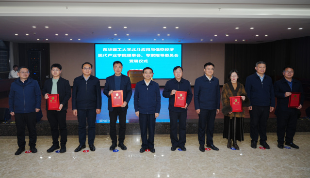 蒋文定、张福庆共同为东华理工大学北斗应用与低空经济现代产业学院揭牌。与会领导为学院首届理事会理事、专家指导委员会代表颁发聘书。