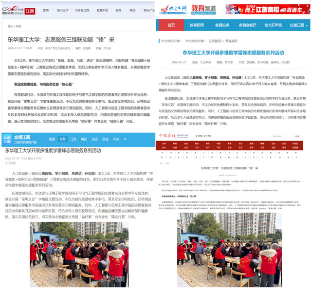 编者按:3月以来,东华理工大学紧扣“奉献、友爱、互助、进步”的志愿精神,创新构建“专业赋能+绿色生态+精神铸魂”三维联动模式志愿服务体系,开展多维度学雷锋志愿服务系列活动。国际在线、大江网、文明江西、中媒在线等主流媒体对此进行报道,引发社会广泛关注。现将原文转载如下: