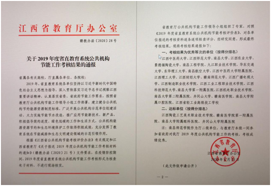 近日,江西省教育厅办公室下发《关于2019年度省直教育系统公共机构节能工作考核结果的通报》(赣教办函[2020]28号),对全省各有关高校、厅直属单位、各院校公共机构节能工作进行通报,我校综合测评得分位居前列,获评“2019年度江西省公共机构节能优秀单位”。