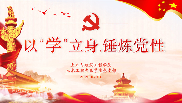2020年7月1日是建党节,也是中国共产党成立99周年的日子,为进一步提升学生党员的党性修养,引领学生党员追寻入党初心,2020年7月1日晚七点,土木与建筑工程学院土木工程专业学生党支部开展了主题为“以学立身,锤炼党性”的线上党旗接力活动。此次党旗接力活动由支部书记杨文瑞主持,土木与建筑工程学院土木工程专业学生党支部全体党员参加。