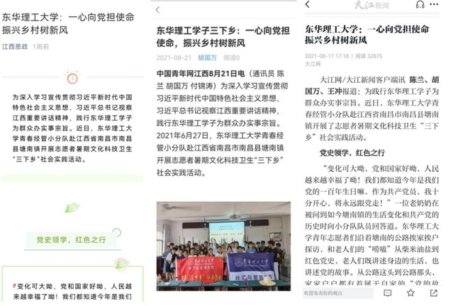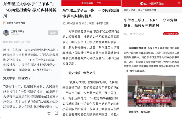 编者按:暑假期间,为深入学习贯彻习近平总书记视察江西重要讲话精神,扎实开展“我为群众办实事”实践活动,助力乡村振兴,东华理工大学经济与管理学院“青春经管小分队”前往江西省南昌市南昌县塘南镇开展了为期一周的暑期“三下乡”社会实践活动。学习强国、中国新闻网、中国教育在线、江西思政、中国青年网、大江网等对此进行报道,引发社会广泛关注,现将相关报道原文转载如下: