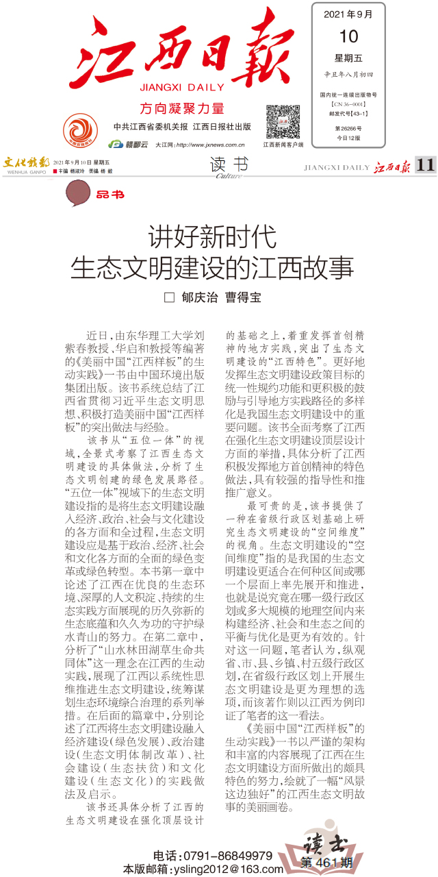 编者按:近日,由东华理工大学刘紫春教授、华启和教授等编著的《美丽中国“江西样板”的生动实践》一书由中国环境出版集团出版。该书系统总结了江西省贯彻习近平生态文明思想、积极打造美丽中国“江西样板”的突出做法与经验。北京大学教授、著名生态文明研究专家郇庆治,博士曹得宝以“讲好新时代生态文明建设的江西故事”为题进行书评,江西日报对此进行报道,现将相关内容转载如下:
