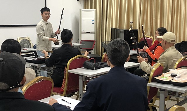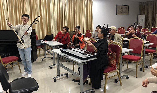 在首堂课中,杨老师从二胡的构造、演奏基本技巧来引导学员对二胡有基本的了解。尽管年轻,但杨老师授课中,特别有耐心,并针对老同志的特点进行了认真的备课。