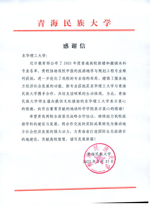 本次专业获批是2021年我校与青海民族大学签订战略合作协议结出的第一个成果,将为青海打造国际生态旅游目的地提供重要人才培养支撑。为感谢我校在申报过程中的支持和帮助,2022年2月,青海民族大学特向我校致感谢信表示感谢。