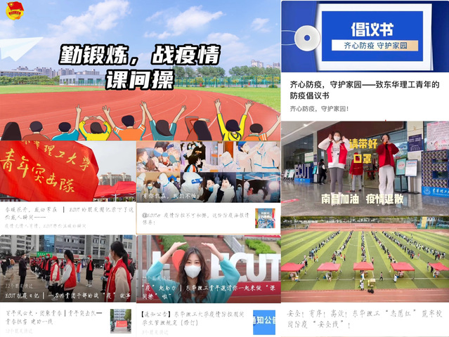 暖心宣传,助力防疫。“不要贴贴,不要贴贴,贴贴危险,还是密接” “不点外卖,病毒进校无门,不带口罩,遍地危机四伏”“预防千万条,口罩第一条”等时下流行防疫宣传标语在校园内随处可见,内容好记又温暖人心。这些条幅标语把疫情防控的基本常识融入其中,时时提醒师生积极配合学校防控要求。校团委以“东华理工青年”和“东华理工大学学生会”等新媒体平台为宣传阵地,挖掘和宣传我校在疫情防控阻击战中涌现的先进个人和典型事迹,讲好青春防疫故事,弘扬和发挥我校青年疫情防控网络正能量,不断传递疫情防控“最强音”,让防疫宣传“声”入人心,目前累计共推出疫情防控推文21篇,防疫视频4个。