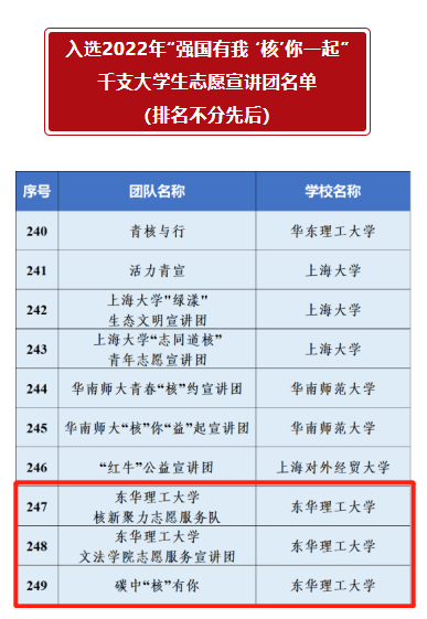 近日,由团中央青年志愿者行动指导中心、中国核工业集团有限公司、中国青年志愿者协会秘书处联合开展的2022年“强国有我‘核’你一起”千支大学生志愿宣讲团活动入选名单公布,东华理工大学核新聚力志愿服务队、文法学院志愿服务宣讲团和碳中“核”有你宣讲团成功入选。
