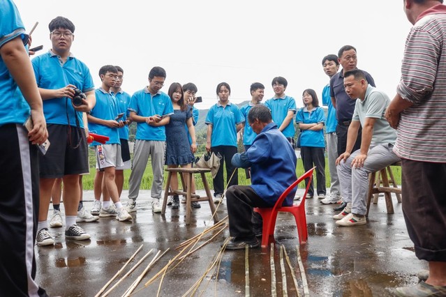 老匠人为同学们展示了竹子到竹篮的制作流程:选竹、劈篾、定框、编制、锁口等工序,长细粗短不同的细蔑在匠人灵巧的双手下,变成了各具特色的蔑制农用制品。2020级电子信息工程专业李熙文感叹道:“看着老人劈蔑、编蔑,总感觉自己都学会了,可真正一上手还真有点无从下手了。”2021级电子科学与技术专业刘馨月兴奋地说道:“作为北方人,第一次看见竹子一步步变成簸箕和竹篮让我觉得很神奇,让我真切体验到江西民俗文化的魅力所在。”