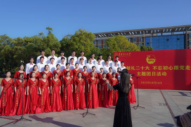 十月的校园秋高气爽,欣欣向荣。意气风发的东华理工青年学子排着整齐的队列庄严肃立,国旗广场东西两侧的红色展板上“青春献礼二十大 不忘初心跟党走”的字幕熠熠生辉。从空中俯瞰,广场上由学生方阵组成的“二十大”和“66”的字标格外醒目。“我们从太行走来,扎根在红土地上,伴随着核工业前进的步伐……”活动开始之前,在场学生高唱校歌,抒发对学校的热爱和祝福。