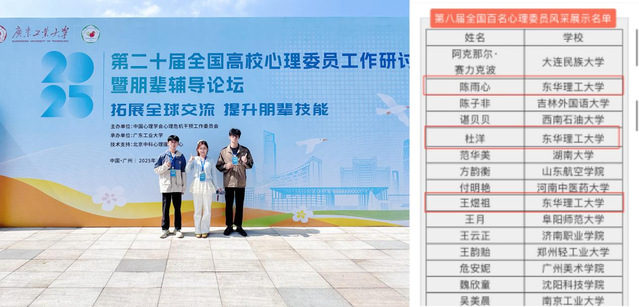 近日,第二十届全国高校心理委员工作研讨会暨朋辈辅导论坛在广东工业大学举办,会上揭晓了第八届“全国百名心理委员风采展”评选结果。东华理工大学王煜祖、杜洋、陈雨心三位同学成功入选。