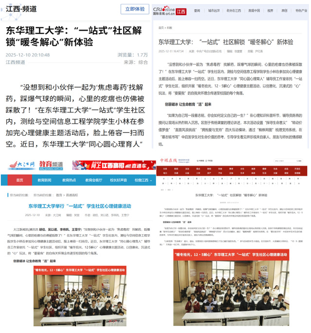 编者按:近日,东华理工大学“同心圆心理育人”辅导员工作室依托“一站式”学生社区,组织开展“暖冬拾光,12・5解心”心理健康主题活动,以创意化、沉浸式的“心”玩法,将“要爱我”的自我关怀理念传递至校园的每个角落。新华社客户端、国际在线、大江网、中媒在线等主流媒体对此进行报道,引发社会广泛关注。现将原文转载如下: