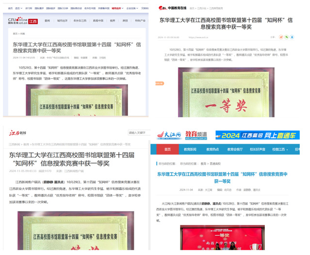 编者按:10月29日,在第十四届“知网杯”信息搜索竞赛决赛中,东华理工大学研究生李猛、杨宇和郭嘉乐组成的代表队获“一等奖”,教师潘洪贞获“优秀指导老师”称号,校图书馆获“团体一等奖”。大江网、国际在线、江西新闻等主流媒体对此进行报道,引发社会广泛关注。现将原文转载如下: