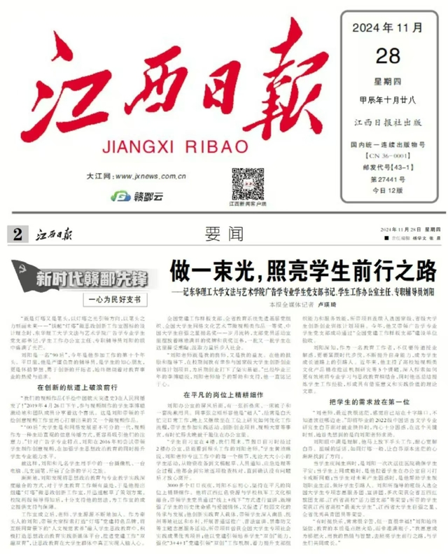 编者按:11月28日,江西日报第2版以“做一束光,照亮学生前行之路”为题,刊登了东华理工大学文法与艺术学院广告学专业学生党支部书记、学生工作办公室主任、专职辅导员刘阳的故事,引发社会广泛关注。现将原文转载如下: