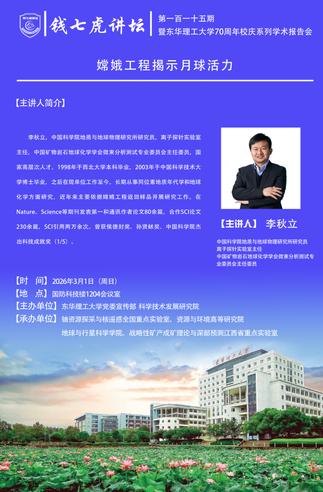 【钱七虎讲坛第一百一十五期暨东华理工大学70周年校庆系列学术报告会预告】嫦娥工程揭示月球活力