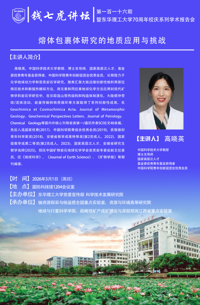 【钱七虎讲坛第一百一十六期暨东华理工大学70周年校庆系列学术报告会预告】熔体包裹体研究的地质应用与挑战