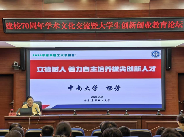 4月15日,东华理工大学在广兰校园行政楼一楼报告厅(抚州校区行政楼三楼会议室同步直播)举办建校70周年学术文化交流暨大学生创新创业教育论坛(第一期)。教育部高校创新创业教育指导委员会委员、中南大学国家创新创业示范基地主任杨芳教授应邀来校作报告。校党委书记张福庆为杨芳教授颁发校外创新创业教育导师聘书。校党委常委、副校长朱笃主持报告会。