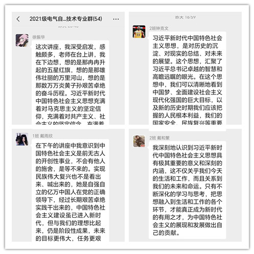 本次讲座在同学们之中引起了强烈的反响,同学们纷纷在微信群中进行交流互动,发表对这次讲座的心得感想,纷纷表示要加强学习习近平新时代中国特色社会主义思想,不忘初心,踔厉奋进!