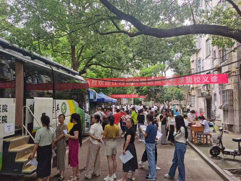 肿瘤筛查车前,前来问诊的人员井然有序,200余人享受到了免费的乳腺钼靶、彩超、心电图检查,现场出具检测报告和诊疗意见。活动当天,资深肿瘤医学专家靳文剑教授、刘冬兰教授为在校师生带来了精彩的肺癌、肠癌科普和防治讲座。