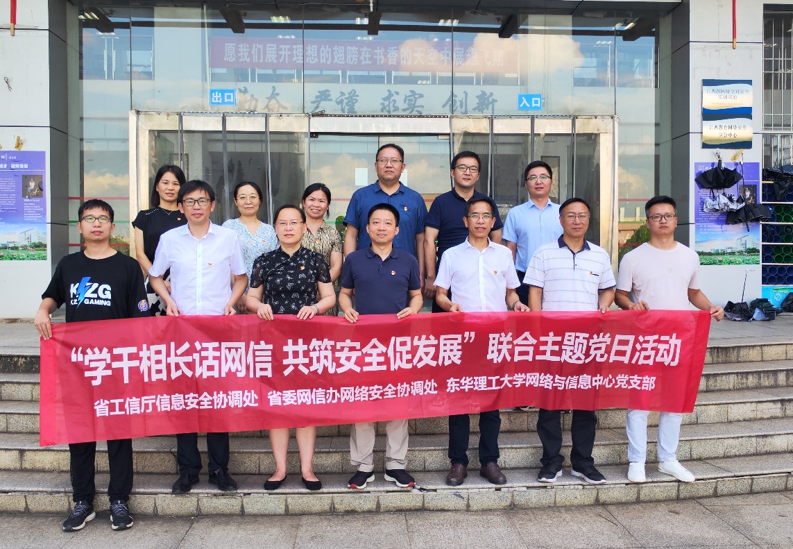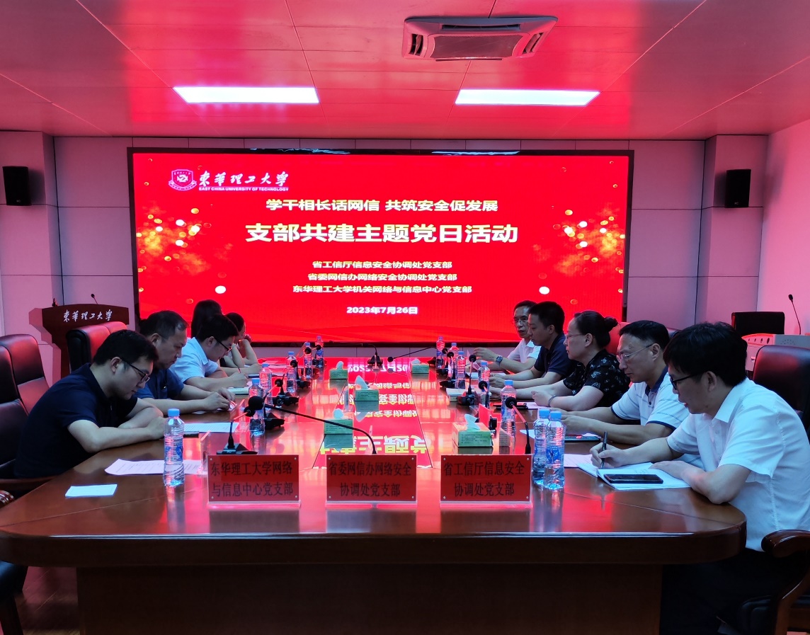 为深入学习贯彻习近平新时代中国特色社会主义思想,推动主题教育走深走实,7月26日下午,机关第二十三党支部(网络与信息中心)与省工信厅信息安全协调处党支部、省委网信办网络安全协调处党支部,在东华理工大学南昌校区联合开展“学干相长话网信、共筑安全促发展”主题党日活动。