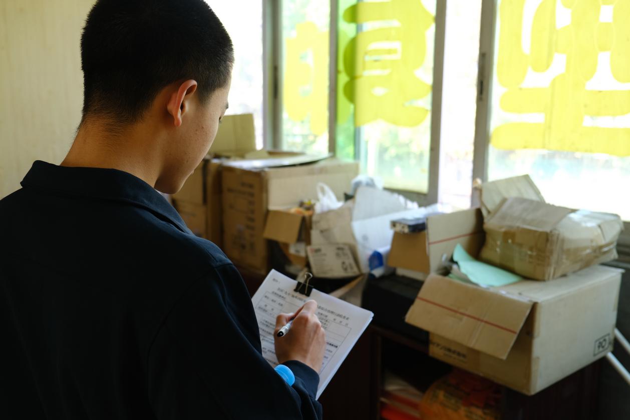 暖心志愿者团队成员来到人民公园沿街商铺,帮助社区工作者进行消防隐患排查走访。