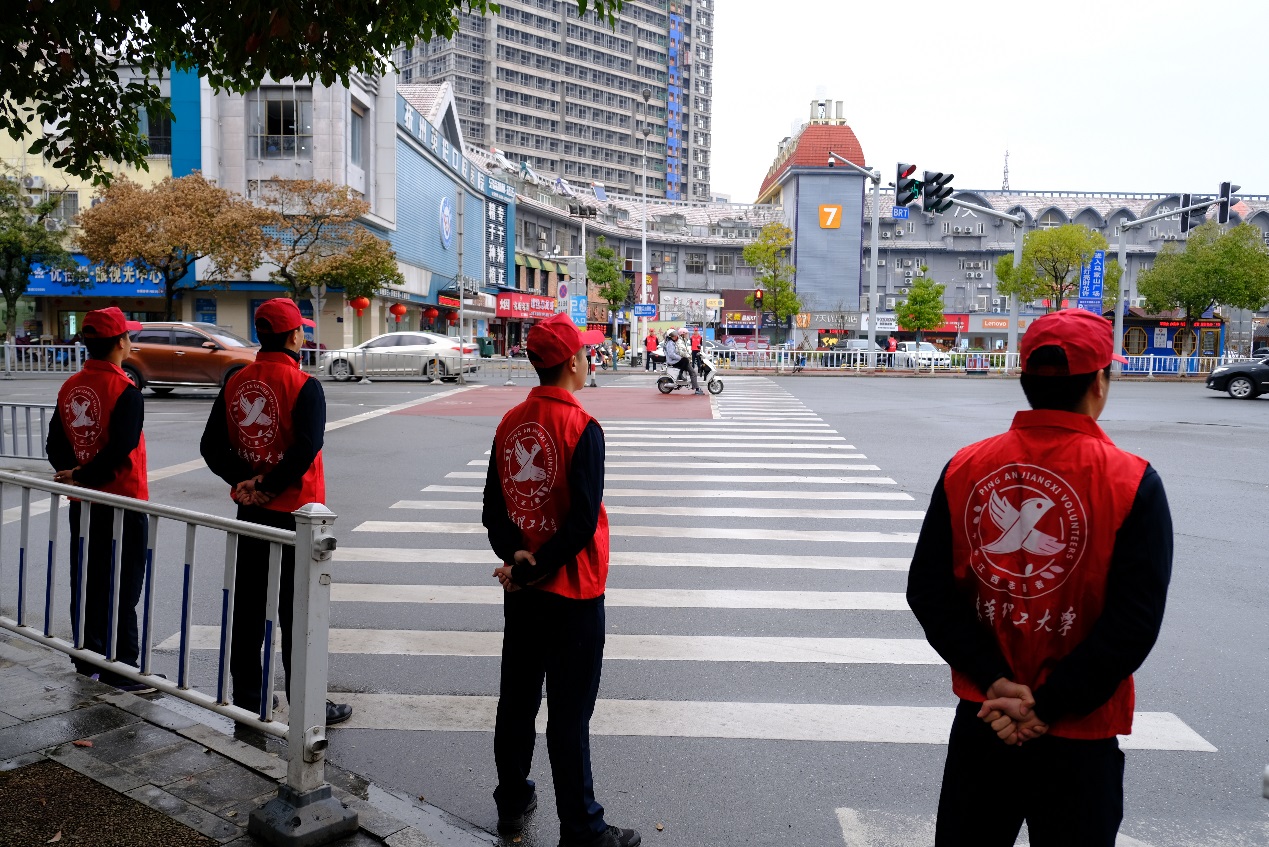 志愿服务队组织开展平安志愿活动,在马家山广场路口,为过往车辆和行人引导交通。