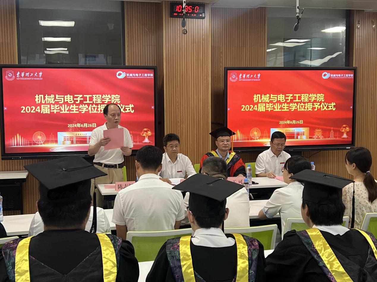 6月26日上午,机械与电子工程学院在四教302教室举办了2024届毕业生学位授予仪式。学院党委书记徐鹏程、院长王可、副院长李跃忠出席,副院长陈志新主持仪式。各系室主任、教师代表、毕业生班主任、辅导员及2024届毕业生代表80余人现场参加仪式。