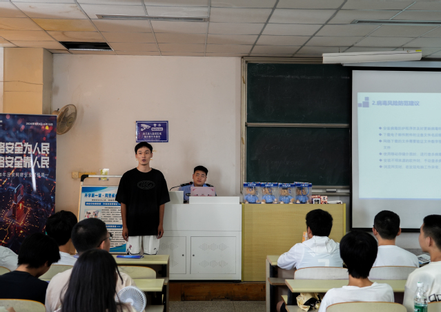2024年9月9日至15日是第11个国家网络安全宣传周。为积极响应国家关于加强网络安全教育的号召,进一提升大学生网络安全意识,软件学院于9月11日下午在第二教学楼阶14教室成功举办了网络安全宣传周主题教育活动。本次活动特别邀请了抚州市公安局网安支队章宇鑫警官作为主讲嘉宾,为全体师生代表带来了一场既专业又接地气的防骗知识盛宴。