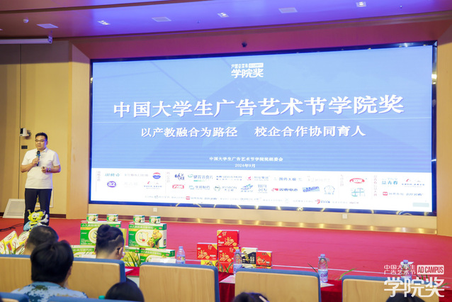 我院党委书记邹红梅在活动中致辞,感谢大广节学院奖组委会为师生提供零距离领略大咖风范、洞悉企业需求、点燃创意激情的宝贵机会,对与会嘉宾、评委及品牌代表表示了热烈的欢迎。她强调此次活动不仅为学生们提供了一个展示创意才华的舞台,更是推动广告教育与行业实践深度融合的重要举措。她表示,学校一直致力于培养具备创新思维和实践能力的广告人才,期待通过此次大赛进一步激发学生的创作热情,提升学生们的专业技能与素养。随后,高鹏铭对美术与设计学院学子在历届赛事中的优秀表现给予了高度认可,代表组委会为东华理工大学美术与设计学院颁发了“中国大学生广告艺术节学院奖2024秋季征集大赛·广告教育推动奖”证书。学院党委副书记徐春金代表学院上台领奖,并向组委会表达了诚挚的谢意。同时,快克、华润紫竹、卫龙等品牌代表也齐聚一堂,介绍企业产品并解析命题,现场氛围热烈非凡。