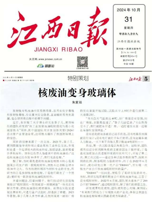 编者按:近日,江西日报以“看东华理工大学学生团队如何让核废油变身玻璃体”为题,刊载了东华理工大学博士研究生李子凡、黄剑领衔的团队研发的“核工业放射废油吸附固化与最小化减容技术”项目填补我国该领域上的空白,并获中国国际大学生创新大赛(2024)总决赛产业赛道金奖的事迹,引发社会广泛关注。现将报道转载如下: