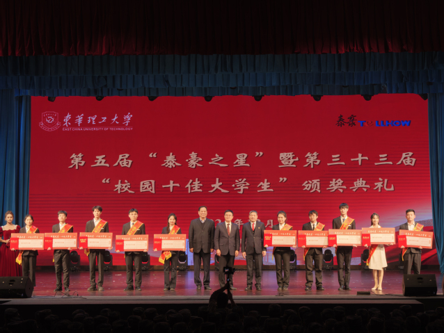 12月29日,东华理工大学“核地花开正当时 笃志聚力新征程”2025年新年晚会暨“泰豪之星”校园十佳大学生颁奖典礼在抚州校区学府校园大礼堂举行。晚会中,校党委书记张福庆,党委副书记、校长罗仙平,泰豪集团董事会副主席李华为第五届“泰豪之星”暨第三十三届“校园十佳大学生”获得者我院研究生王泽成、“钱七虎班”本科生周亚松颁奖。