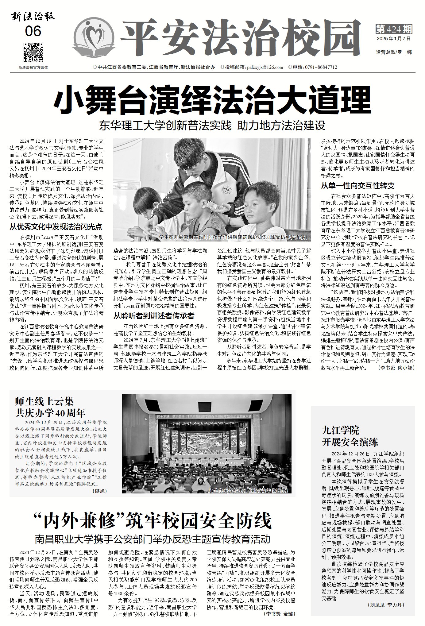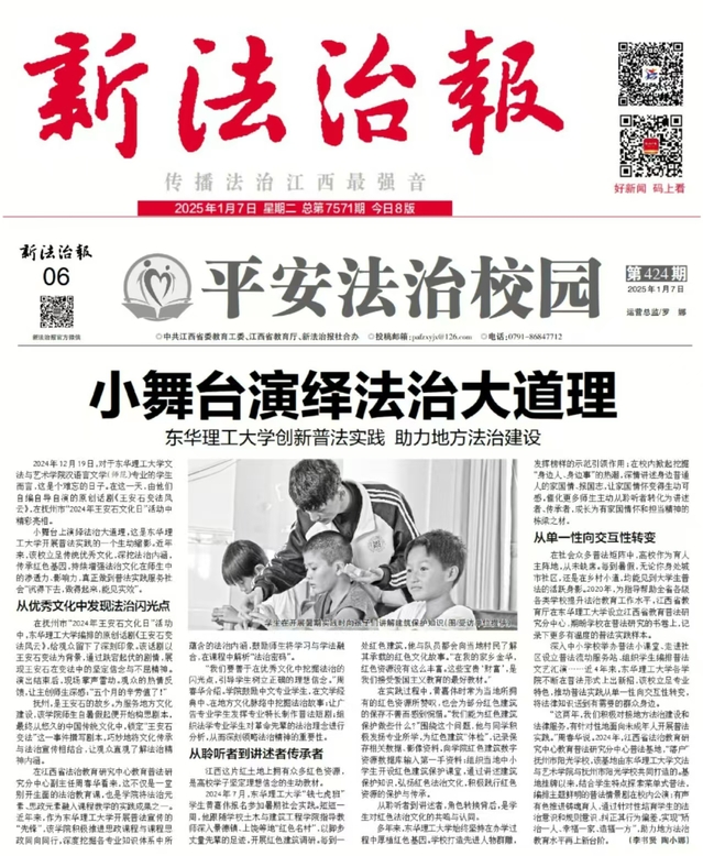 编者按:1月7日,《新法治报》第六版头条以“小舞台演绎法治大道理”为题报道东华理工大学创新普法实践,助力地方法治建设事迹,引发社会广泛关注。现将原文转载如下: