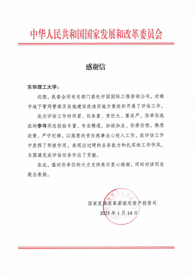 近日,东华理工大学知联会副会长李寻教授积极协助城市地下管网管廊及设施建设改造实施方案评估工作,受到国家发展改革委固定资产投资司来信表扬和感谢。
