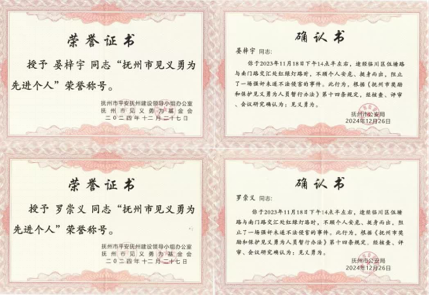 2023年11月18日下午2:30左右,晏梓宇和罗崇义在路过抚州市临川区伍塘路与南门路交汇处红绿灯时,遇到两个小学生向他们求助,他们毫不犹豫地跟着小学生赶过去查看情况,发现一名中年男子正对一名年轻女子实施不轨行为。晏梓宇和罗崇义见状义愤填膺当即呵斥,晏梓宇两次踹向那名男子,为了保护该女子和周围群众,他们不断与该男子周旋,并在适当时机拨打了110报警电话,将现场的情况准确报给了接线员。在与该男子对峙过程中,两人几次险些被该男子手中的剪刀挥中。警察同志赶到现场后,晏梓宇和罗崇义积极配合警察成功将该男子制服。